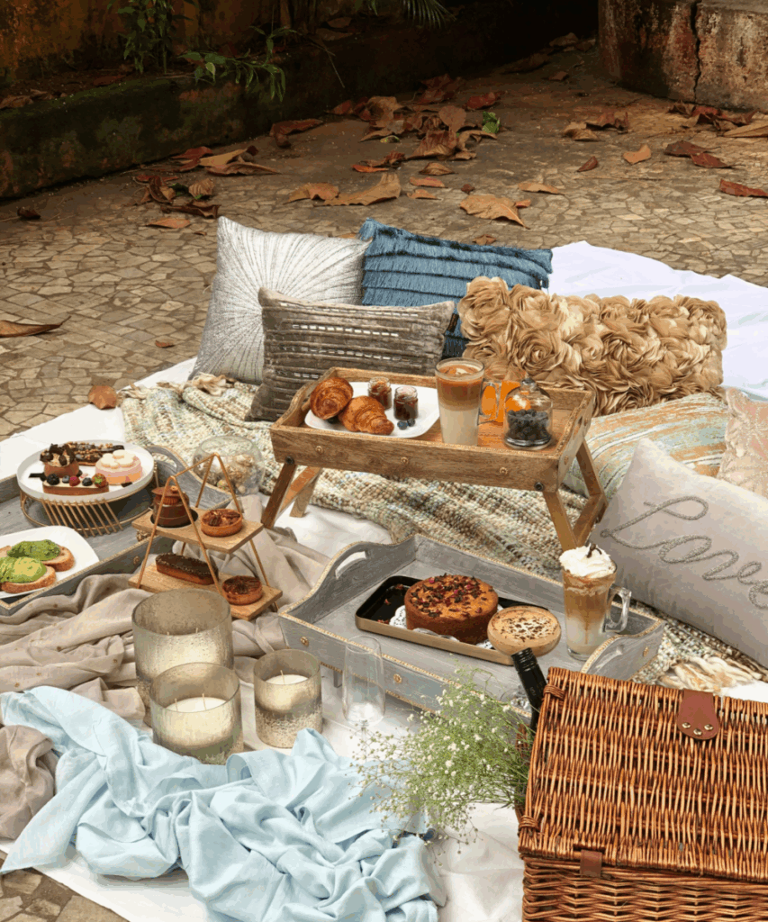 For this kind of setup, I’d lean into color and cozy textures. Go with a deep toned blanket, bring florals in warm shades, and pair pretty desserts like macarons or cupcakes with fall-inspired drinks like chai or spiced cider. Dried oranges or cinnamon sticks make great little props so this is something you can add.