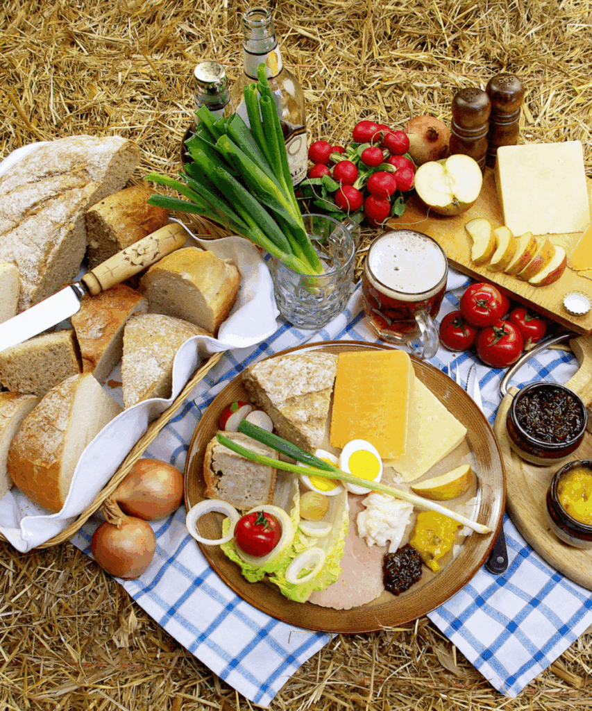 For a cozy and hearty picnic like this, keep it simple and go with the classics: bread, cheese, spreads, and fresh veggies or fruit. If you have a cutting board and some jam jars, you’re basically all set. It’s easy to throw together and so satisfying, especially when paired with your favorite drink and some fresh air.