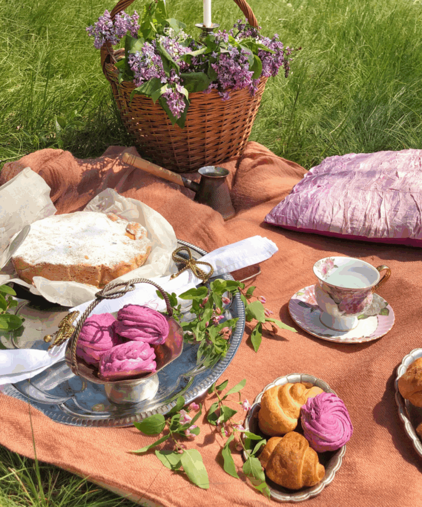 To lean into the cottagecore vibes, think breads, fruit, a sponge cake and soft cheeses. You don’t need a ton of decor, just mix a couple of picnic blankets and let the food and sunshine do the rest.
