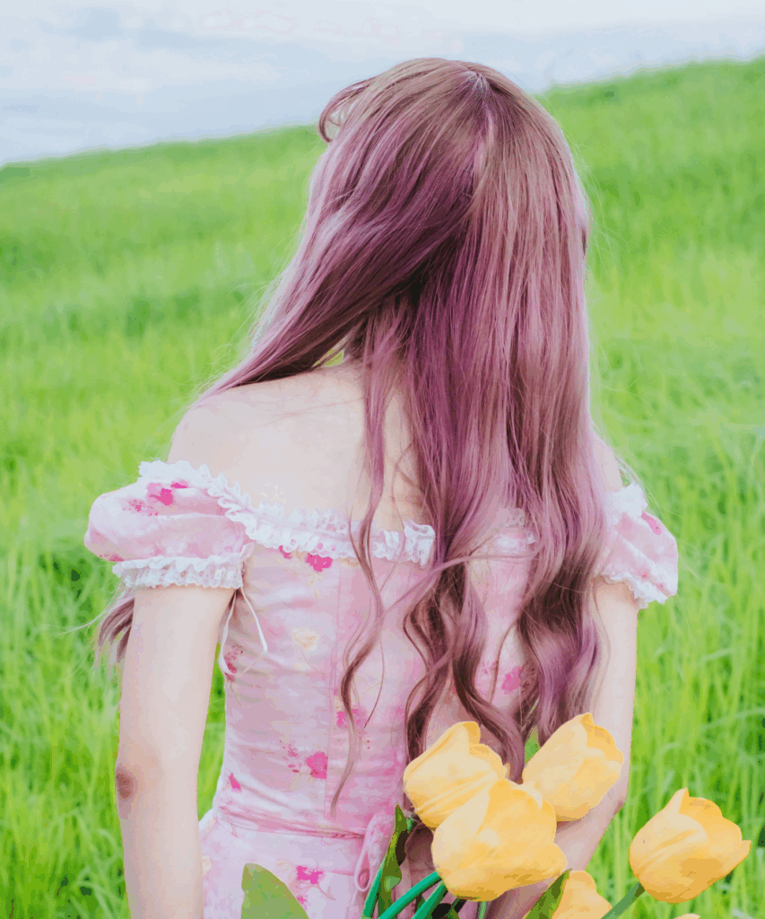 This hairstyle is giving cottagecore princess. The color melt from a natural root into a pink-lavender tone is so soft and graceful and the long waves just add to the dreamy vibe. It’s subtle enough to feel natural but unique enough to still stand out. You can tell this color was chosen to blend in beautifully with the outfit and the entire aesthetic.