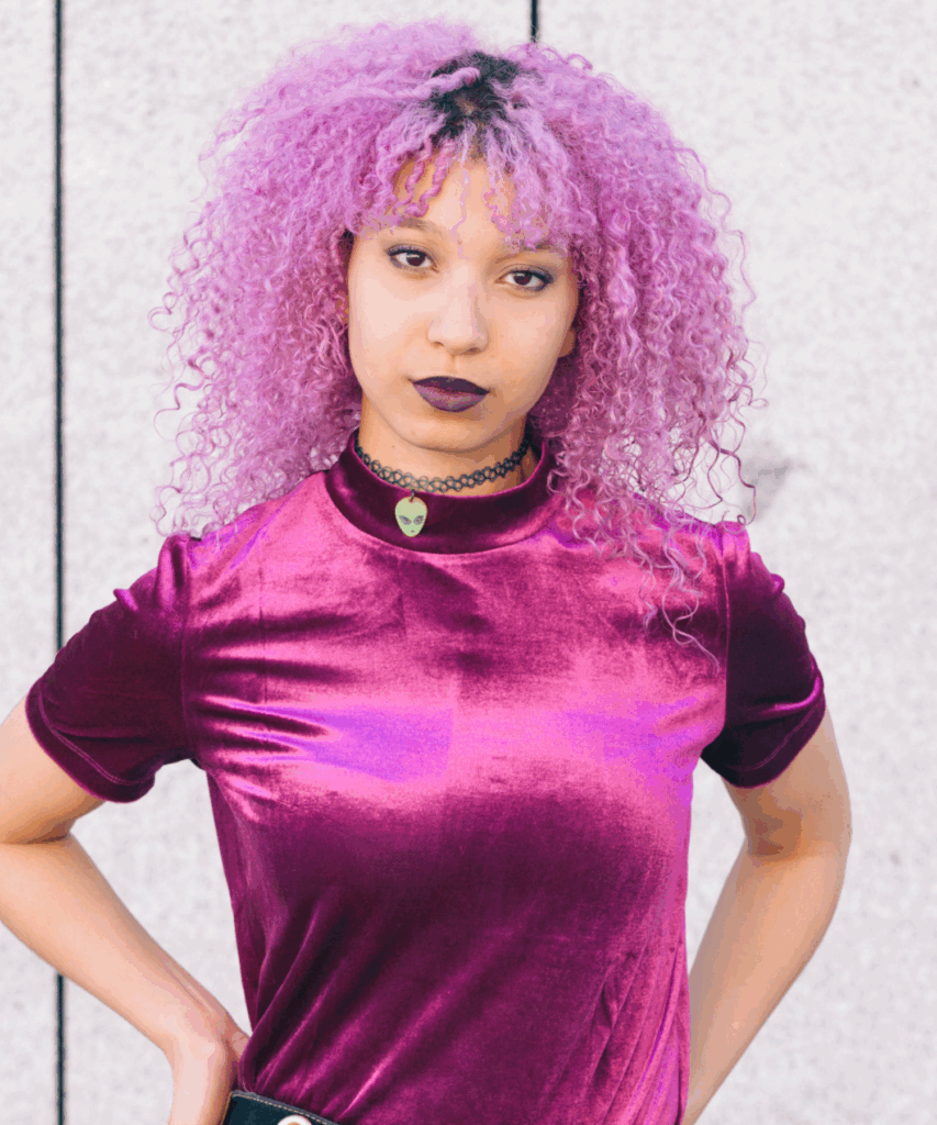 If you’re thinking about going all in with purple this is a fun shade to consider. It adds instant personality to any outfit and really embraces the playful side of purple hair. If you’re styling it with something edgy like velvet or just letting the curls do their thing this look gives serious confidence energy.