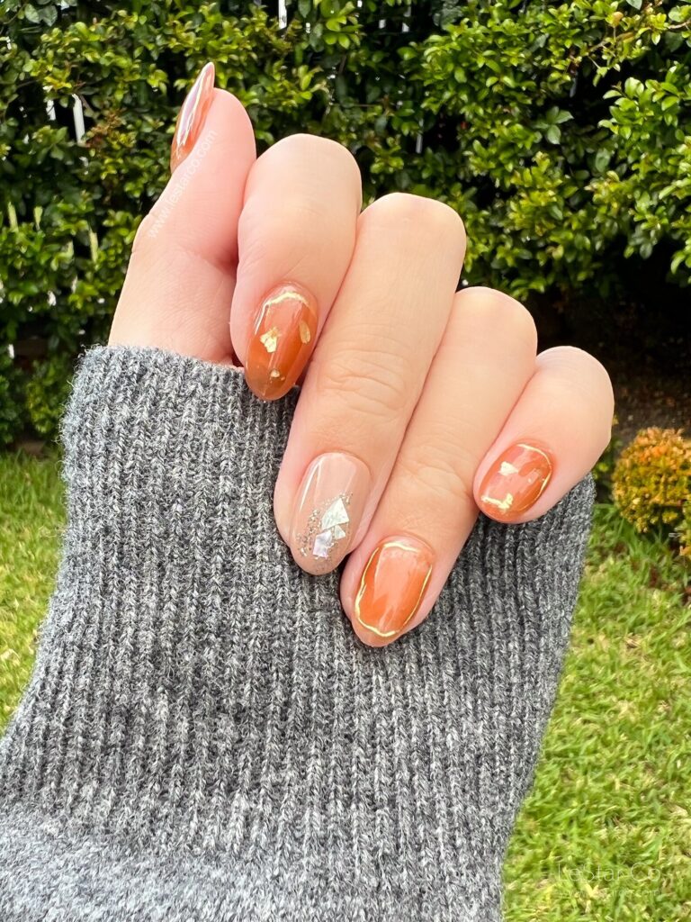 This is such a gorgeous option for anyone who loves fall’s earthy tones but also wants a bit of shine. The way the color shifts from warm brown to translucent feels like crisp leaves swirling in the breeze, adding a delicate touch to shorter nails.