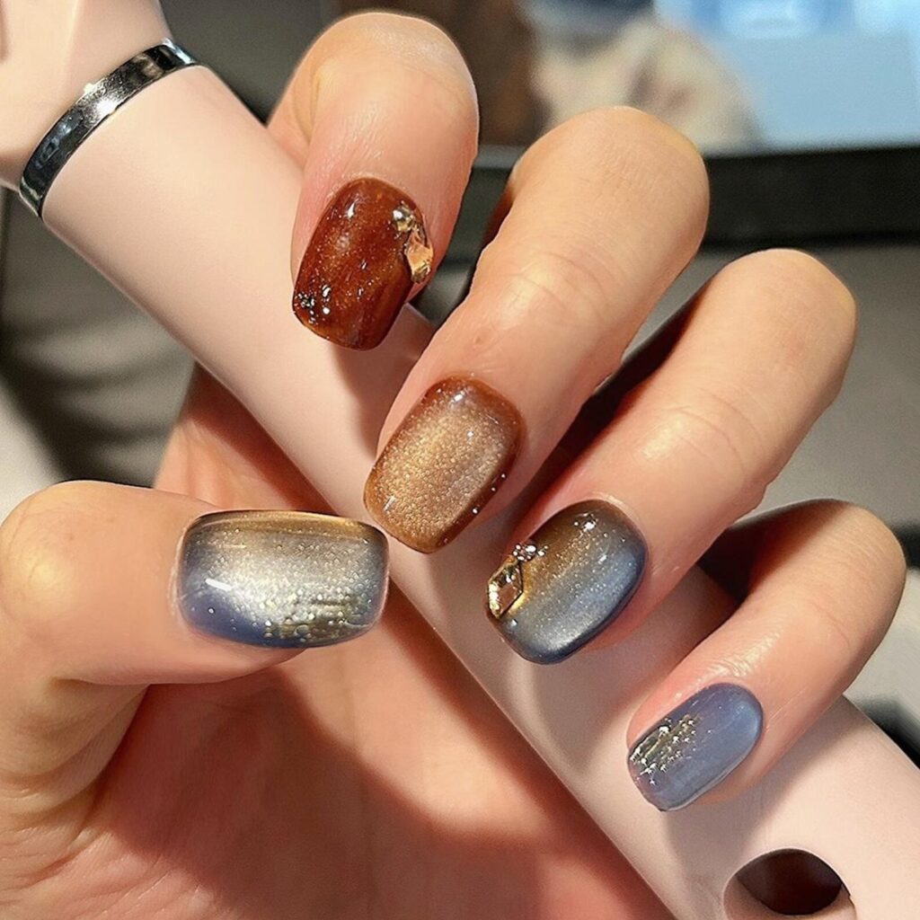 A stunning mix of copper, gold, and silvery blues creates a mesmerizing metallic effect that’s pure fall glam. Each nail is a little different, like a shifting autumn sky or the glimmer of sunlight on wet leaves.