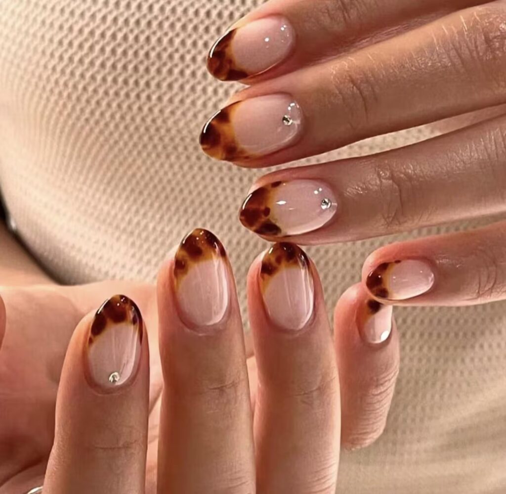 Tortoise shell tips on a sheer nude base feel effortlessly stylish and so in tune with fall’s earthy palette. The touch of rhinestones adds just a hint of sparkle, elevating this trendy look into something even more eye-catching.