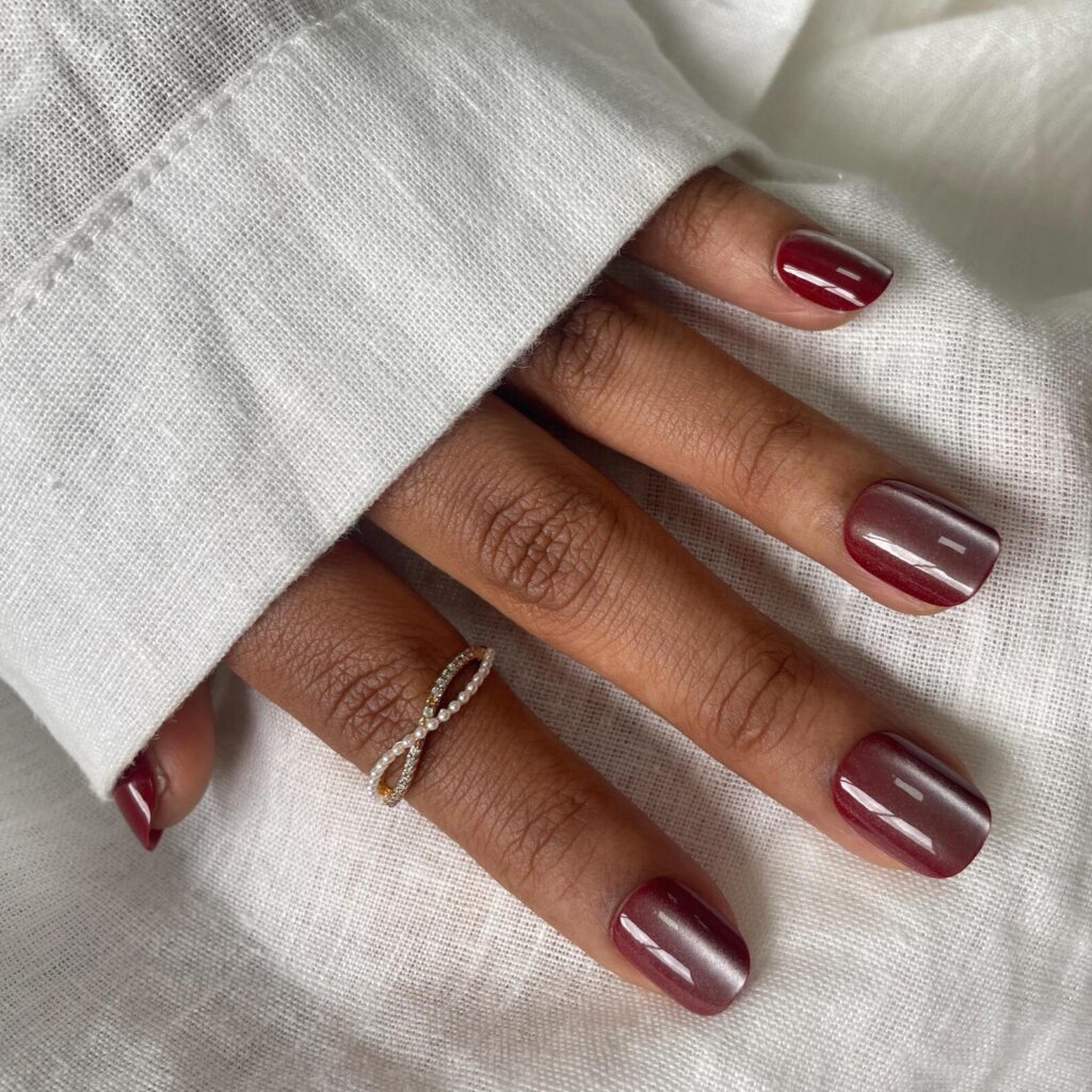 A luscious cranberry red on short nails feels timeless and cozy for fall. This color carries a touch of vintage glamour while remaining modern and fresh, especially with that flawless glossy finish.