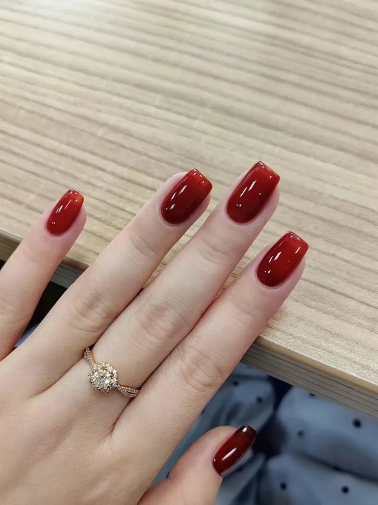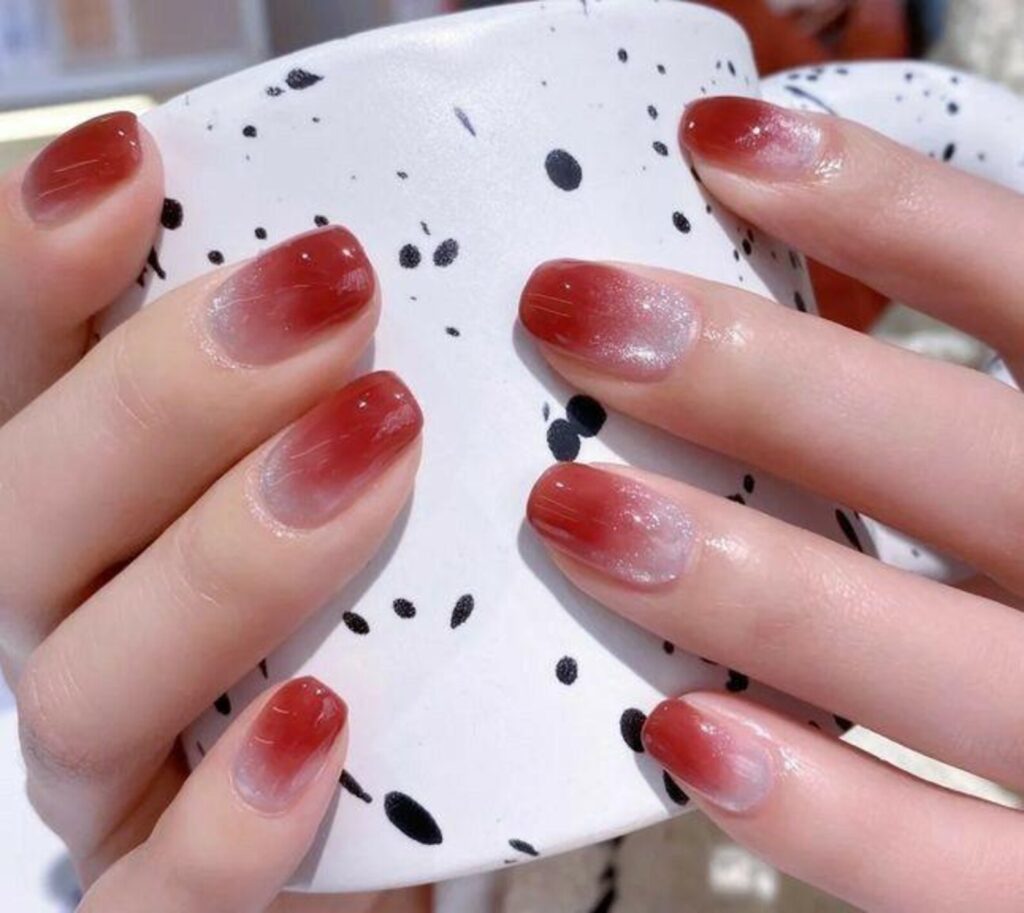 Wine red fading into a translucent tip creates a romantic ombre that feels both modern and classic. The soft gradient gives the nails a delicate look, letting the deep color shine without feeling too heavy.