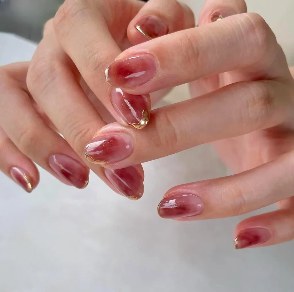Soft washes of berry pink with subtle gold edging feel delicate and luxurious all at once. The translucent effect adds depth while the thin gold border outlines each nail like a piece of fine jewelry.