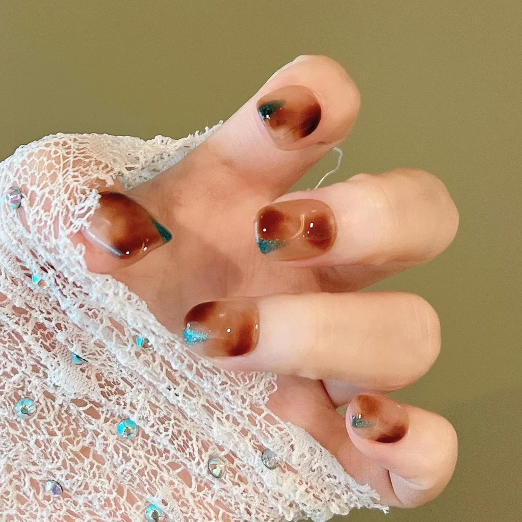 Brown marble swirls bring serious fall feels, and those unexpected pops of teal on the tips add such a cool twist. It’s like combining rich caramel tones with a hint of gemstone shimmer, creating a look that’s equal parts cozy and artistic.