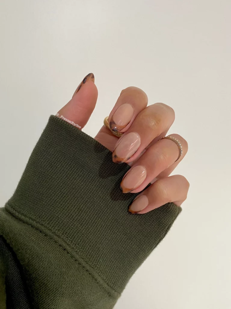 Tortoise shell tips on a sheer, nude base bring a trendy yet classic touch to fall nails. The subtle mix of browns and blacks at the edges makes this design feel elegant while adding just enough interest to stand out.