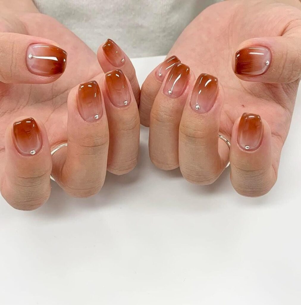 A soft gradient of amber tones fading into a sheer base gives off cozy autumn vibes. Tiny crystal dots sprinkled across the nails add just enough sparkle to make things feel festive without going full glam.