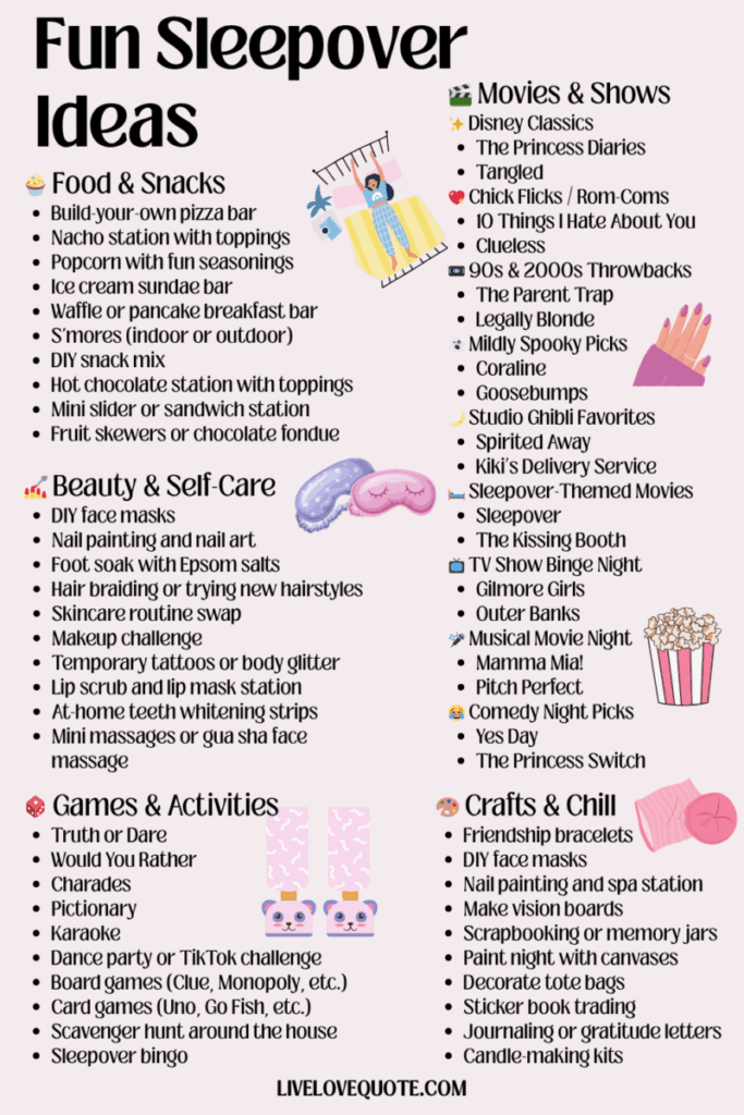 I’m obsessed with movie marathons at sleepovers. It’s the best way to wind down, cuddle up with snacks, and just relax together. Depending on the vibe, you can go funny, nostalgic, magical, or even slightly spooky (but not too scary, because I’m a baby about horror).