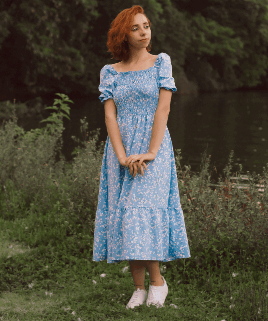 This soft blue floral dress gives me all the cottagecore vibes I love during the summer. The smocked bodice hugs just right, and those puff sleeves are such a sweet touch. You can feel so put together in this dress without doing too much, and the midi length is perfect for everything from a morning stroll to a weekend picnic.