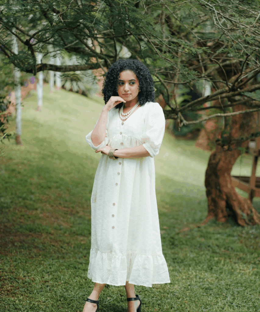 There’s something about a white dress in the summer that just feels right, and this one nails it. The eyelet fabric is light and delicate, and those wooden-style buttons down the front give it a touch of vintage charm. The flowy silhouette means you can move around comfortably and still feel feminine.