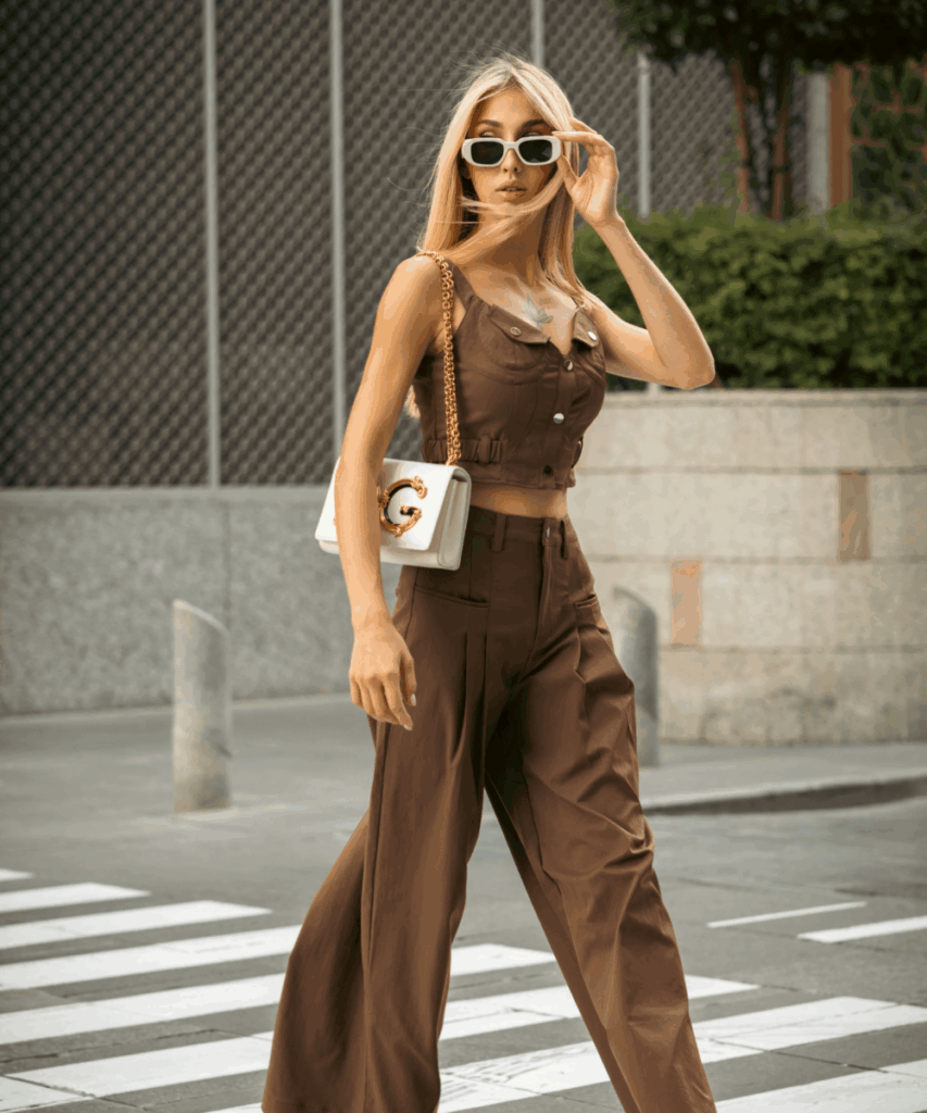 This brown co-ord set is giving stylish city girl energy. I love how the fitted cropped top and high-waisted wide, leg pants create such a sleek silhouette, and the rich color feels like a fresh take on summer neutrals. The buttons and stitching add just enough detail to keep it interesting without being too much.