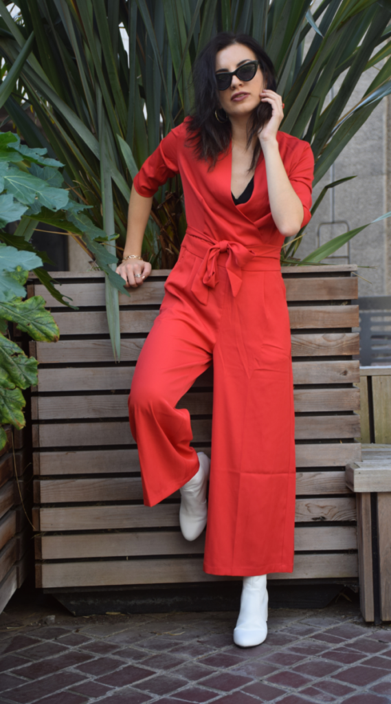This red jumpsuit is a showstopper, with its wrap-front design and tie waist adding just the right touch of femininity. Imagine wearing this to a rooftop Valentine’s party, you’d look so sophisticated and stylish. Add bold earrings and ankle boots, and you’re all set.