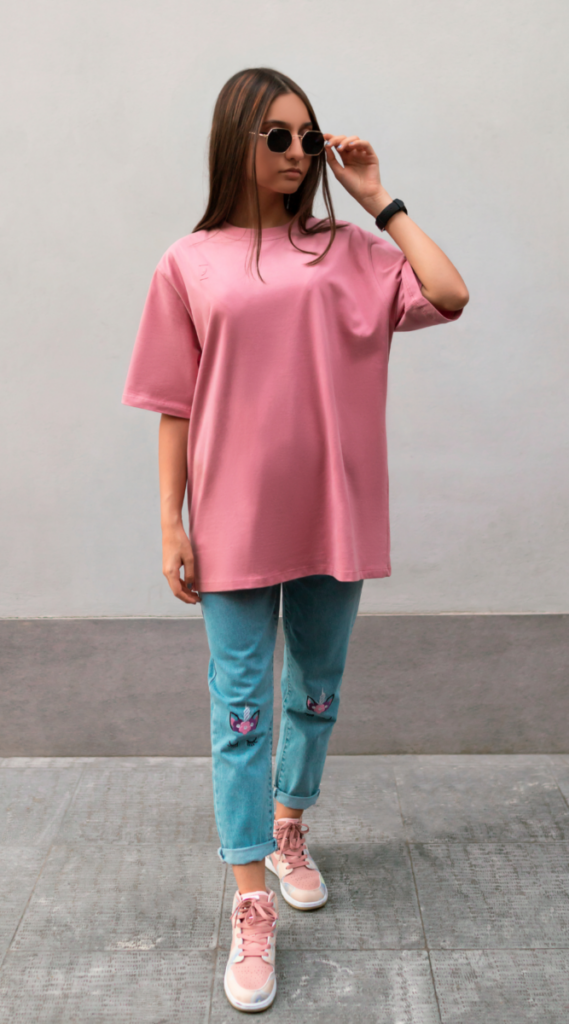 This oversized pink tee paired with embroidered jeans is a laid-back yet stylish option for Valentine’s. I imagine myself wearing this for a coffee date or a fun outdoor outing. You’d feel comfortable while still looking trendy, especially with those fun sneakers.