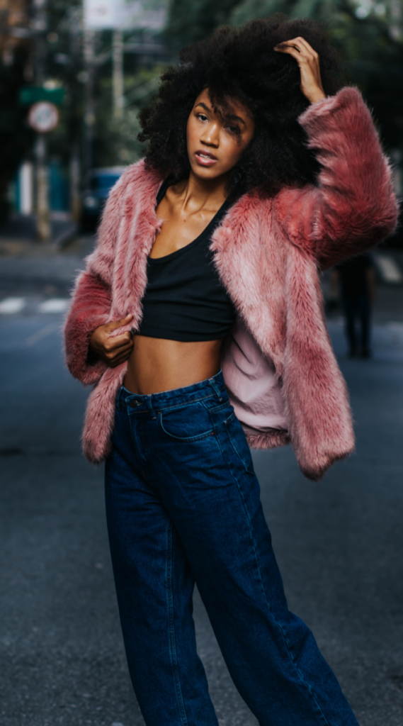 This cropped black top paired with a pink fur jacket and high-waisted jeans is a bold, street-chic look. I’d rock this on a city date, it’s edgy but still has that Valentine’s vibe. You’d feel confident and ready to take on the night with this combo.