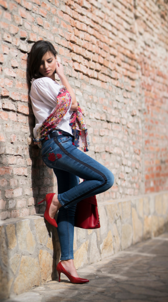 This casual look with embroidered jeans, red heels, and a flowy floral scarf feels effortless yet charming. I’d wear this for a casual Valentine’s lunch date, it’s comfortable but still has that romantic touch. You’d love how versatile this outfit feels, perfect for a relaxed and stylish vibe.