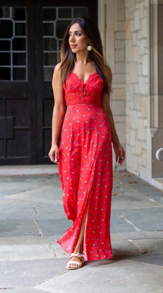 This breezy red maxi dress with tiny floral prints is a blend of elegance and ease. I imagine myself wearing this for a sunset Valentine’s dinner—it’s playful yet sophisticated. You could totally style it with some delicate earrings and flat sandals for a romantic, laid-back vibe.
