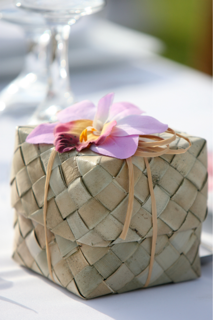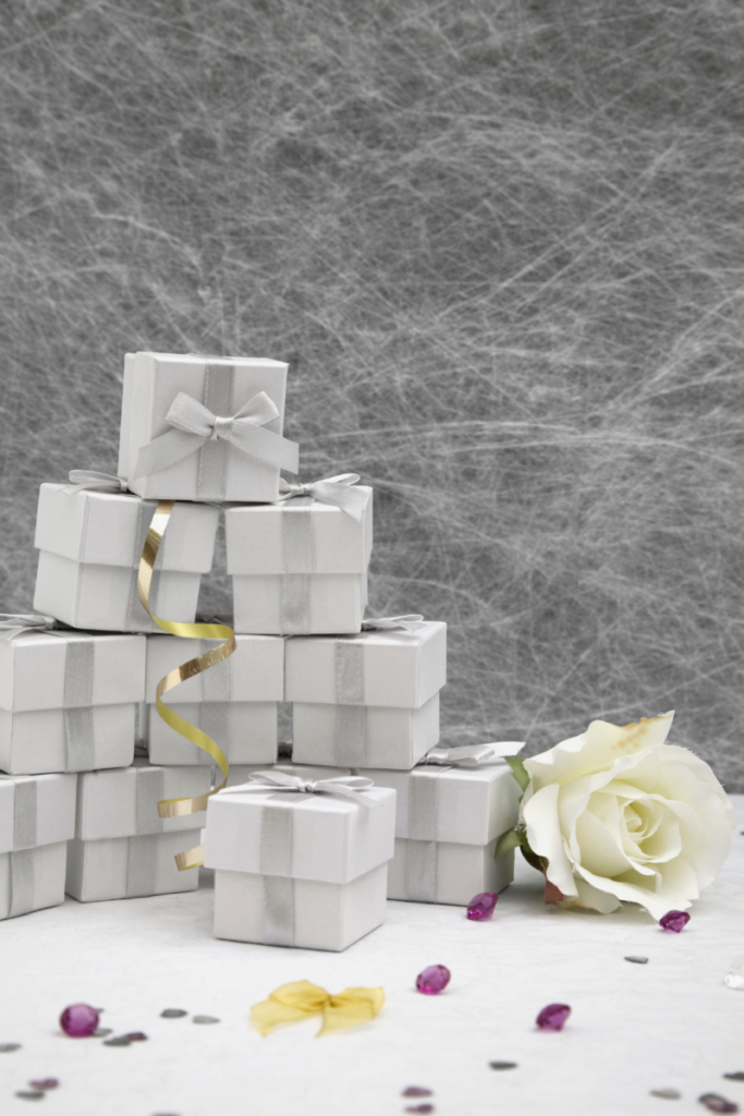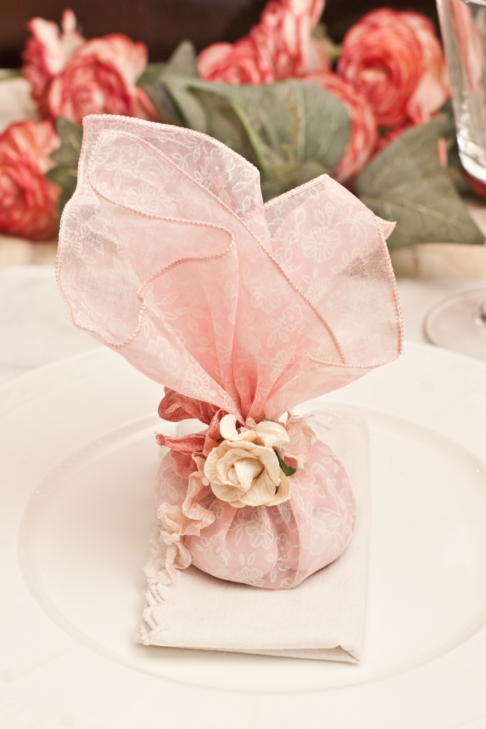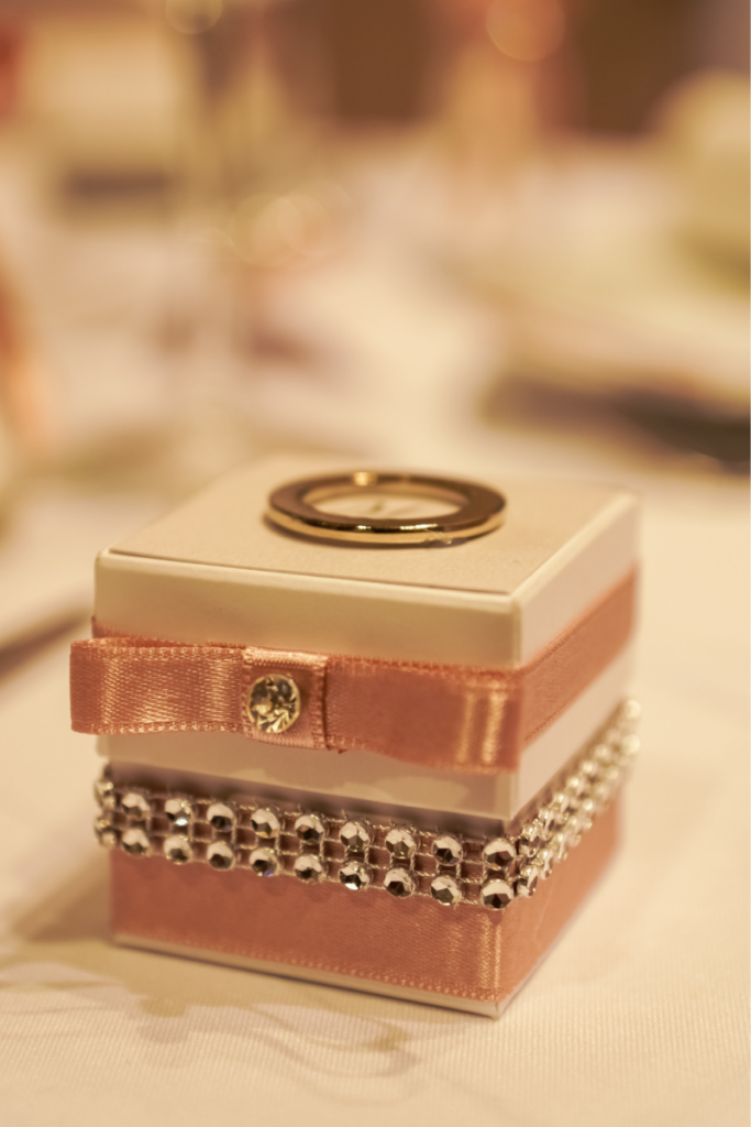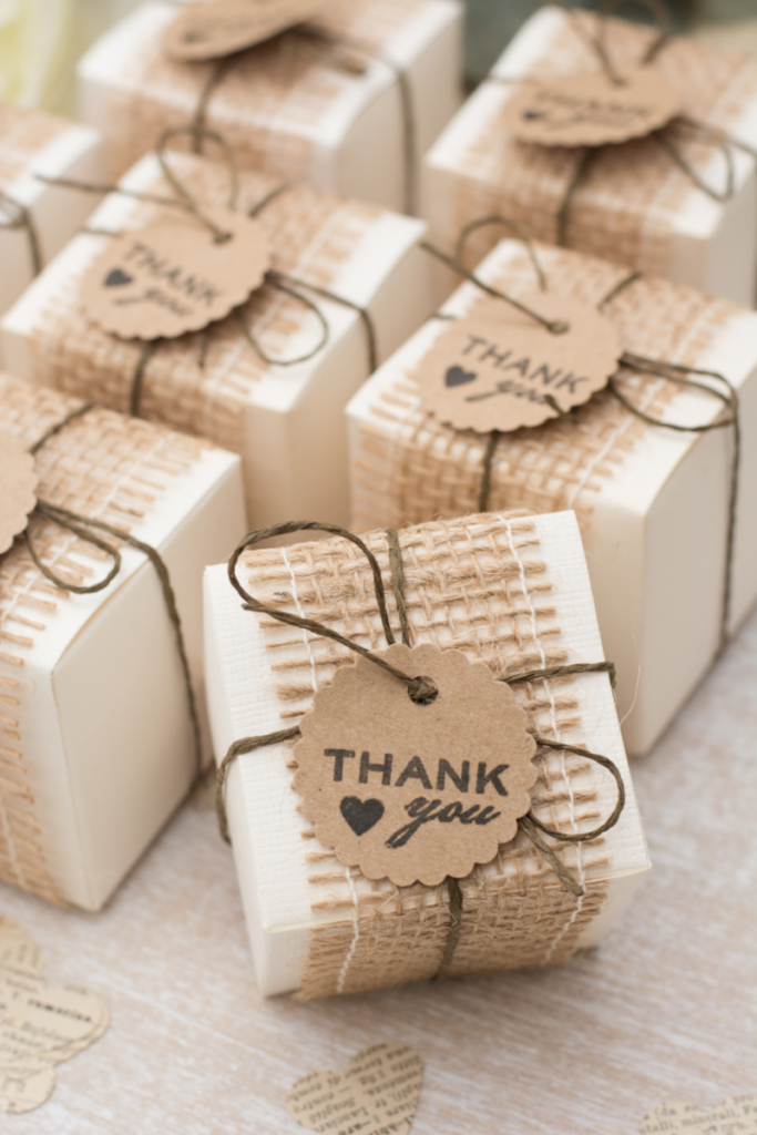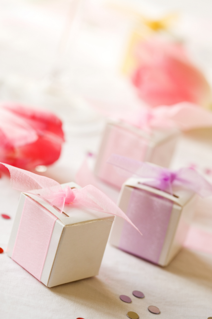 These embossed boxes tied with a pale pink ribbon are classy without trying too hard. They’d be ideal for something lasting, like a nice pen or a compact mirror, something your guests can use well after the wedding day.