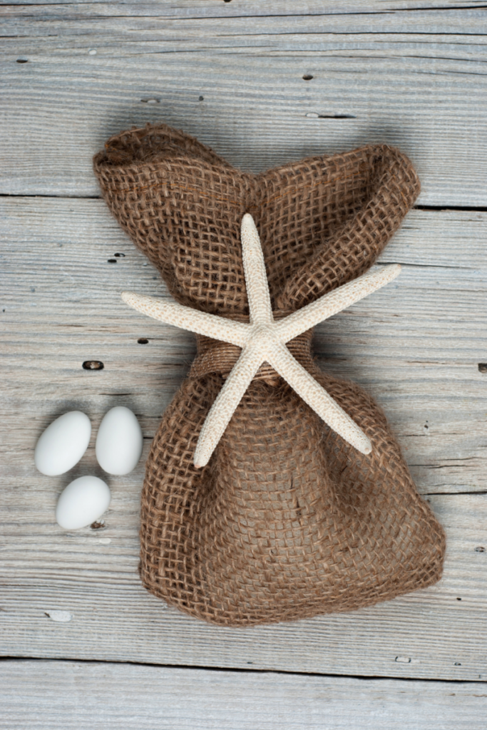 Burlap sacks tied off with a starfish are perfect for a beach-themed wedding. You could stick with the theme and include saltwater taffy or even a small bottle of sand for guests to remember the day.