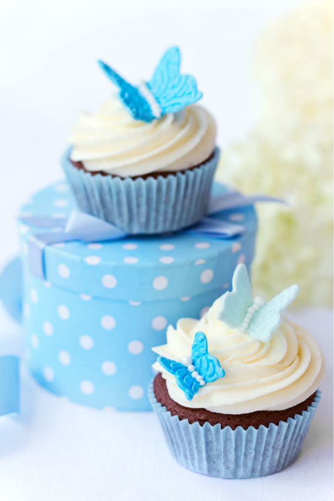 These cupcakes come with a little surprise on top—a blue butterfly that looks almost too good to eat. They’re sitting pretty on a dotted blue box and are a great way to add a splash of color and sweetness to your table.