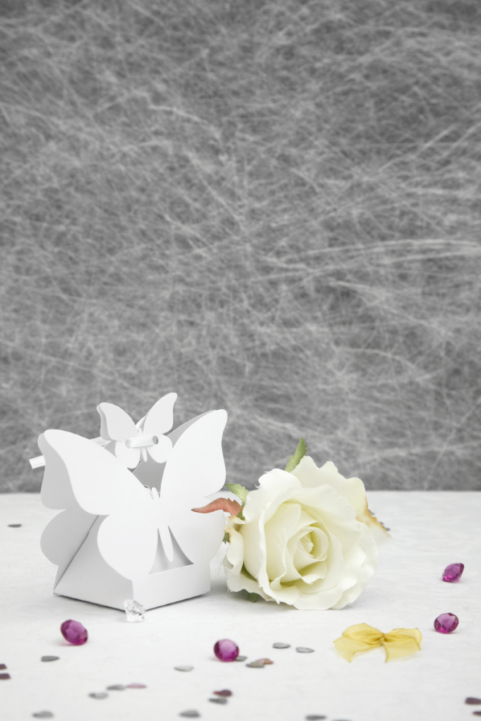 These white boxes with a butterfly cut-out are a simple, yet elegant choice. They’re great for a couple of homemade cookies or a small trinket like a custom magnet.