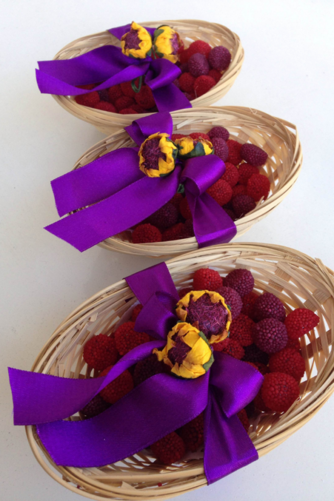 Wrapped up in bold purple ribbons, these berry baskets are a fresh pick. It’s like handing out a little bit of healthy sweetness that looks as good as it tastes.