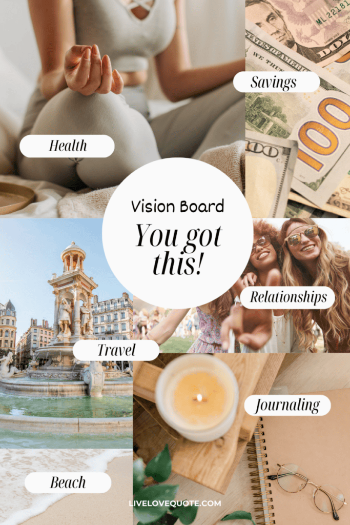 Healthy relationships are vital for a fulfilling life. Include photos that represent happy family moments or close friendships. Visuals of gatherings, celebrations, and quality time together can be motivating. Words like “love,” “support,” and “connection” can emphasize the importance of these relationships.